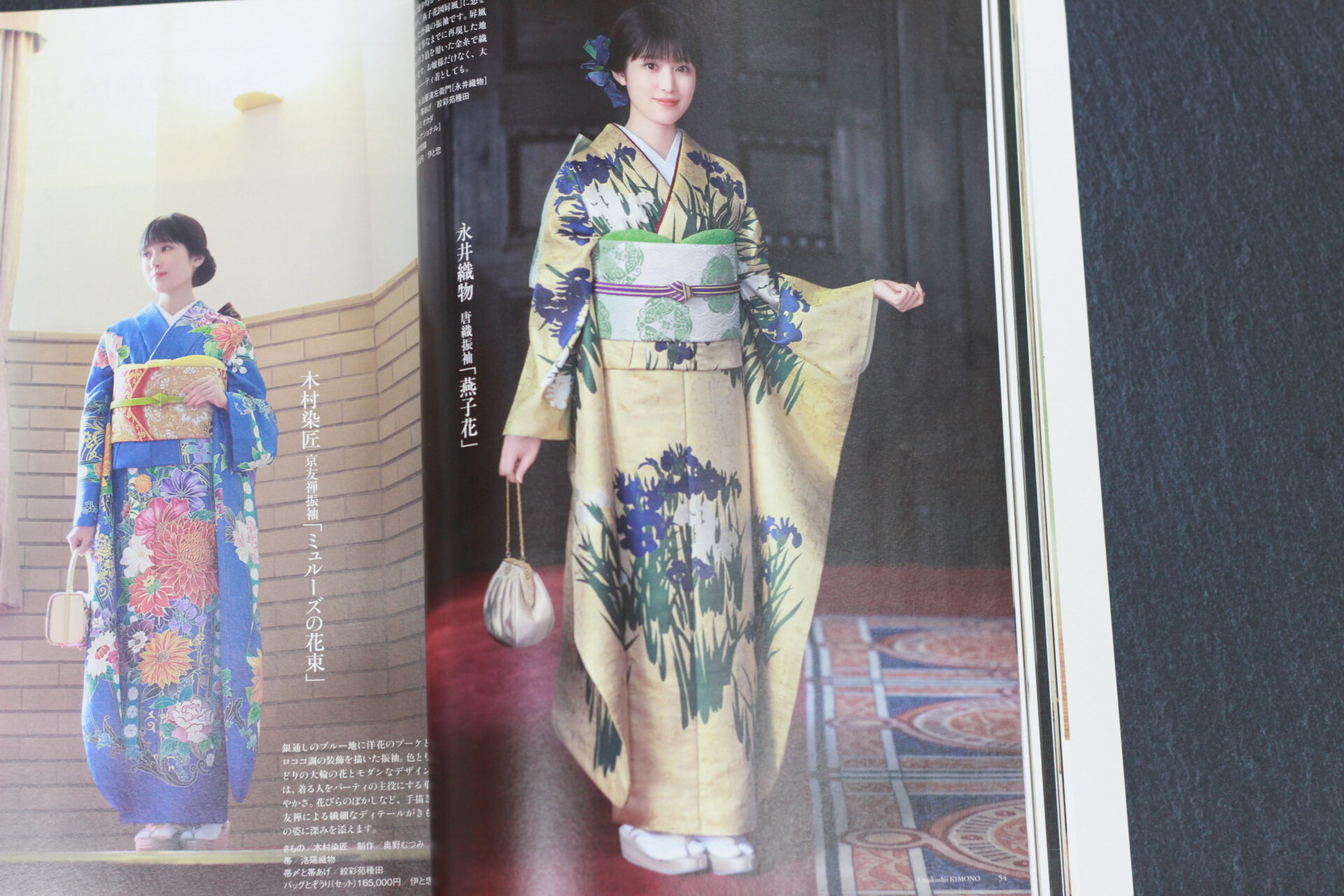 【バックナンバー】「美しいキモノ2024年冬号」 2026年1月5日 お知らせ - メディア掲載「美しいキモノ2024年冬号」特集として 令和の逸品、ここに集結 いちばん豪華なきものが見たい に掲載されました。p54 第4章 福本莉子さん、極上の振袖に出会うきもの:燕子花 袋帯 :雲立涌に三ツ蝶丸文 七代目清左衛門著 『芸術を着るきもの』好評発売中